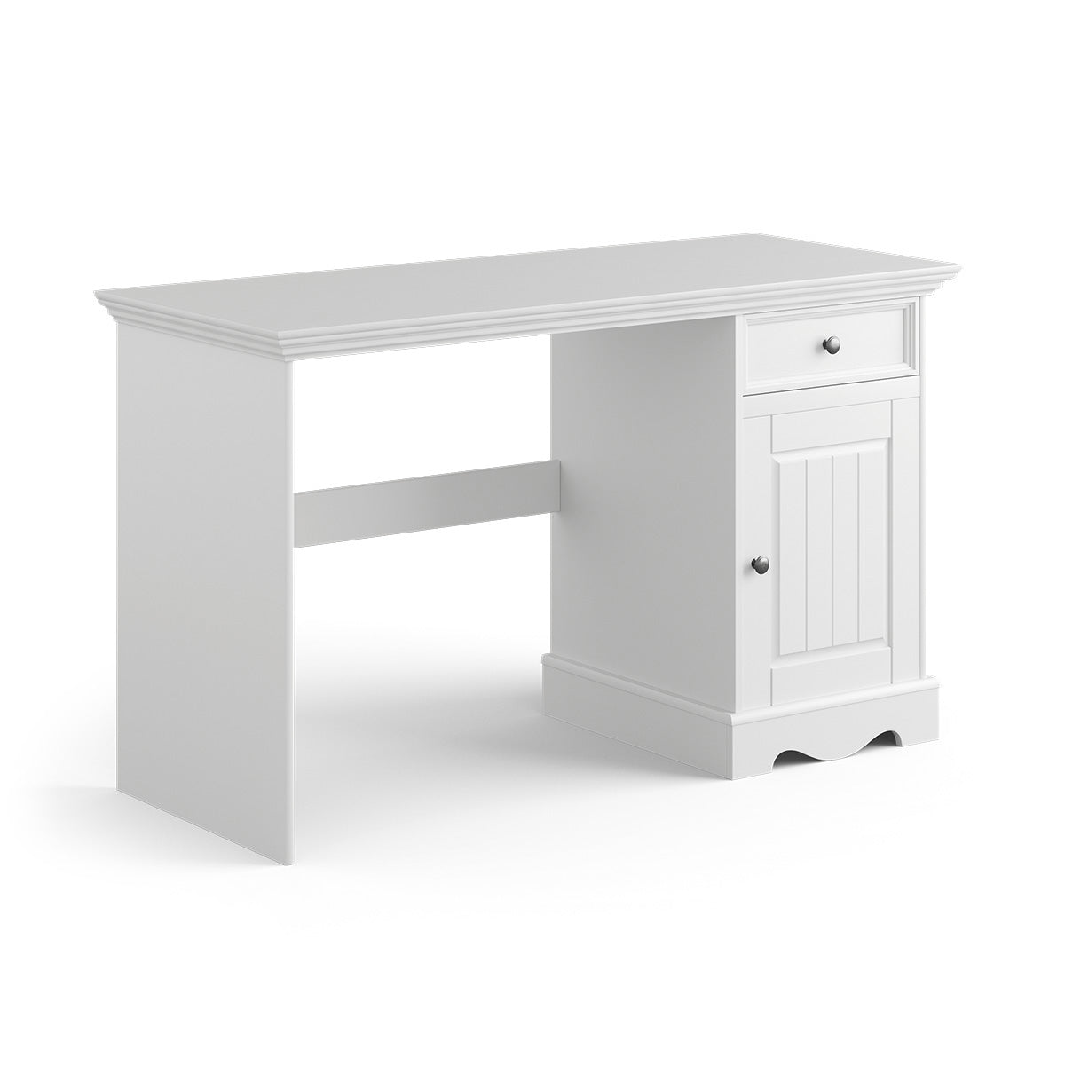 Ob zum Arbeiten, Lernen oder kreative Projekte – dieser zeitlose Holzschreibtisch bietet mit Schubladen und einem geräumigen Schrank genügend Stauraum für Bücher, Dokumente & Schreibutensilien. Die edle Verarbeitung mit dezenten Fräsungen und stilvollen Griffen unterstreicht den Provence-Charme dieses Möbelstücks.
